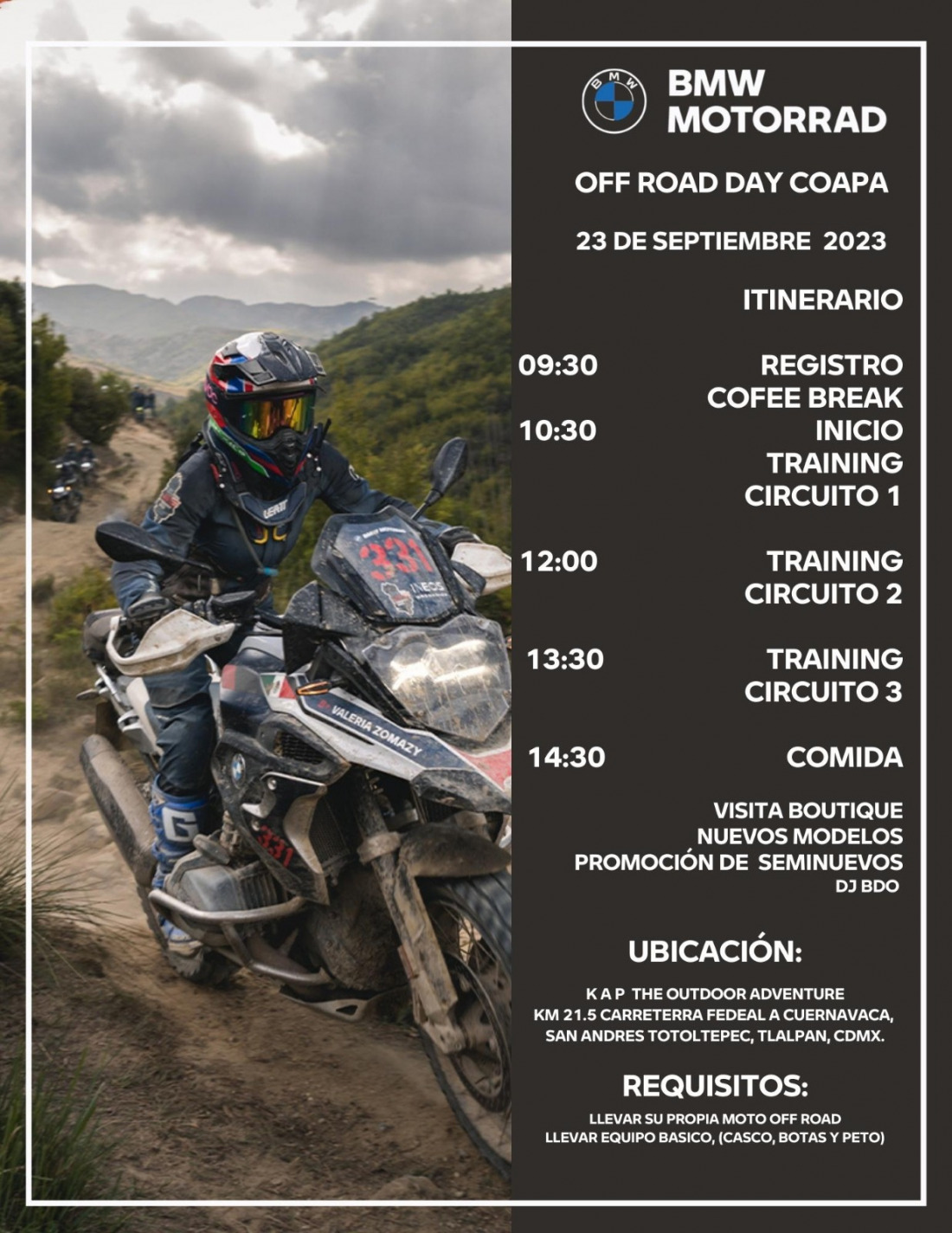 Te esperamos el próximo sábado 23 de septiembre a partir de las 9:30 AM en el KAP para que disfrutes de un OFF ROAD DAY que organizan nuestros amigos de BMW MOTORRAD.